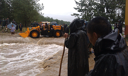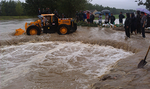 銀澤小霸王立即投入到抗洪救災之中,主要負責物資的運輸、修復受損路段,以及鏟裝砂石料裝入運輸車輛等工作。在大坡度的防洪大堤面前、面對著濤濤江水,裝載機沒有打怵、機手更沒有害怕;銀澤小霸王將一條條裝滿砂石的防洪編織袋投入滾滾的江水之中,成為抗洪搶險中的金剛!
